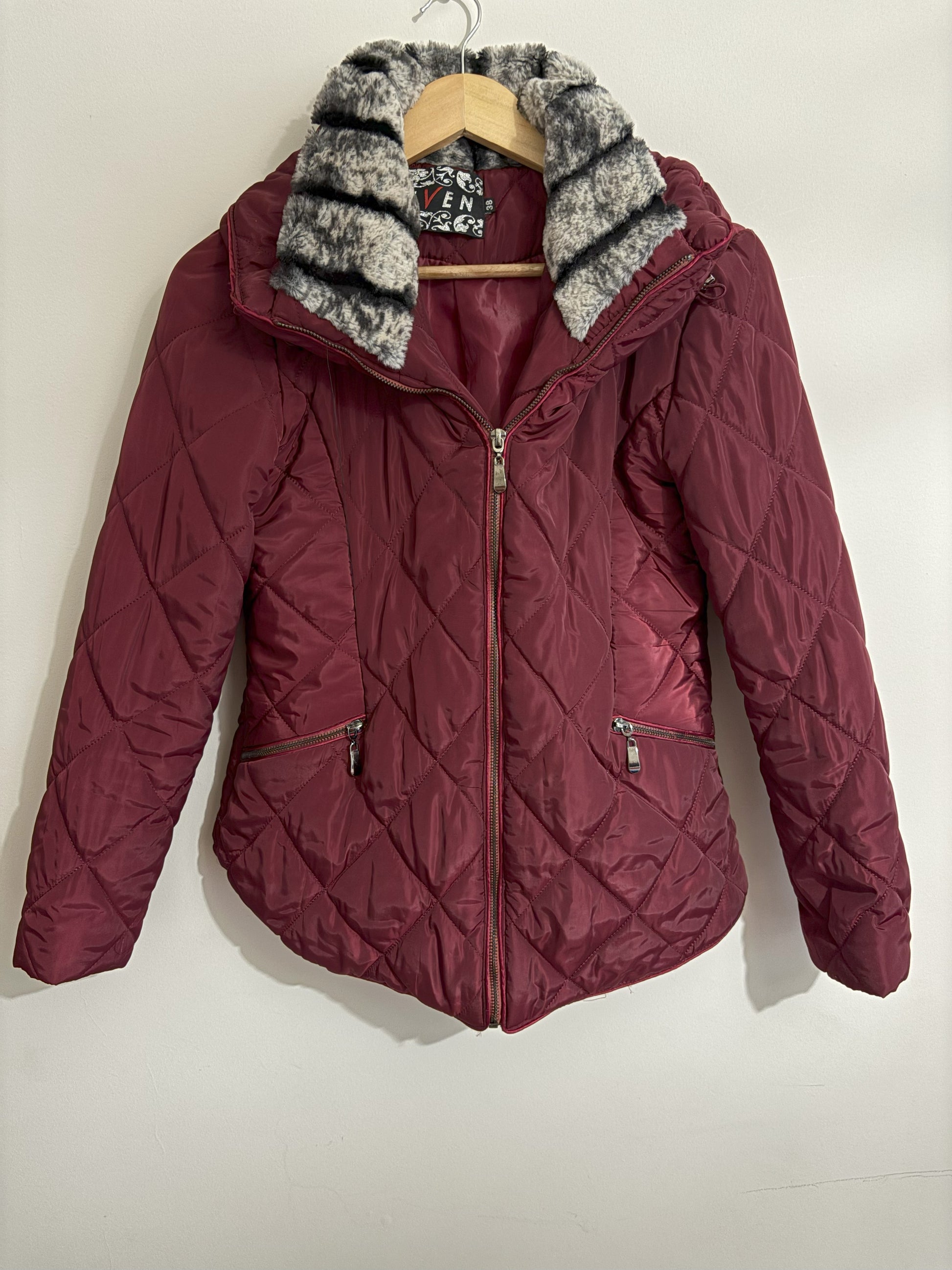 Burgundy Quilted Winter Jacket with Faux Fur Collar