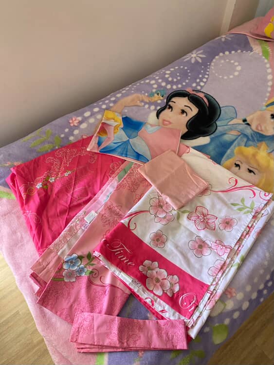 - 1 Full Sheet Set (includes fitted sheet, top sheet, and pillowcase) with pink floral and princess designs.