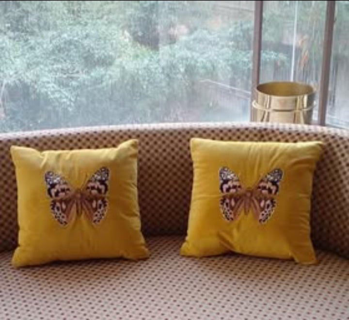 - Design: Butterfly embroidery (1 cushion), plain velvet (1 cushion)