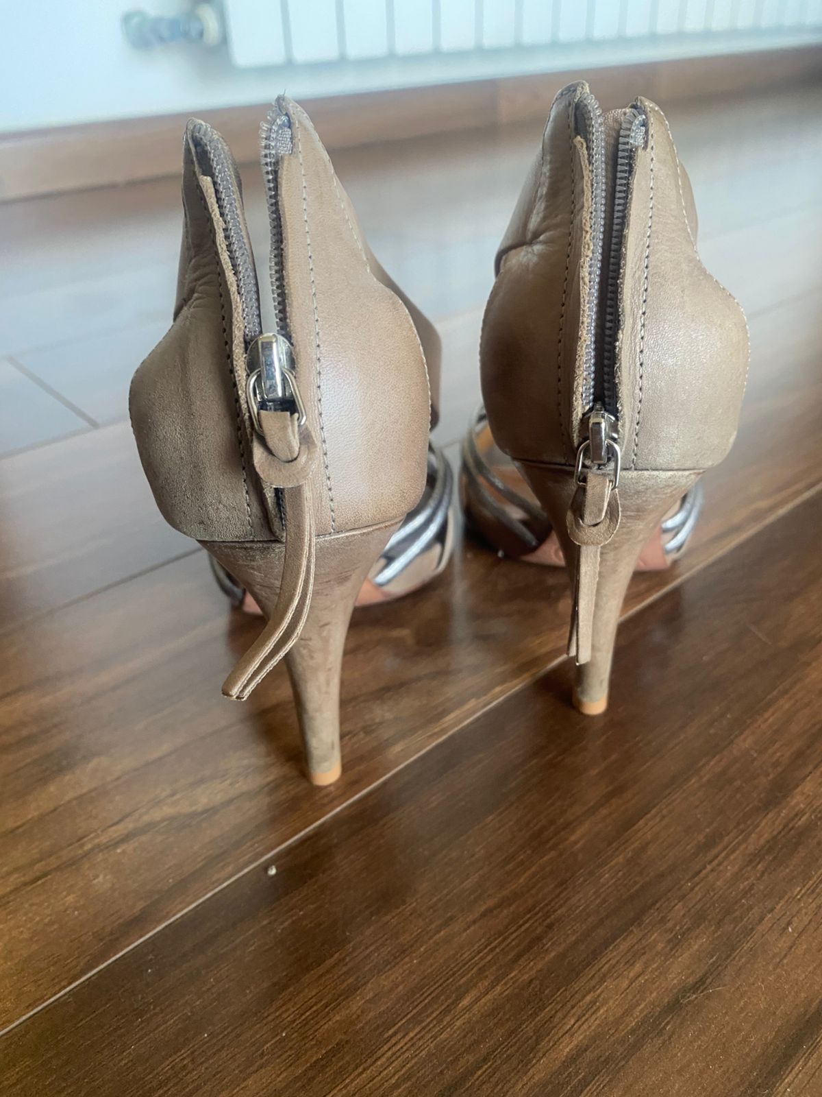 - Color: Taupe with metallic grey straps
